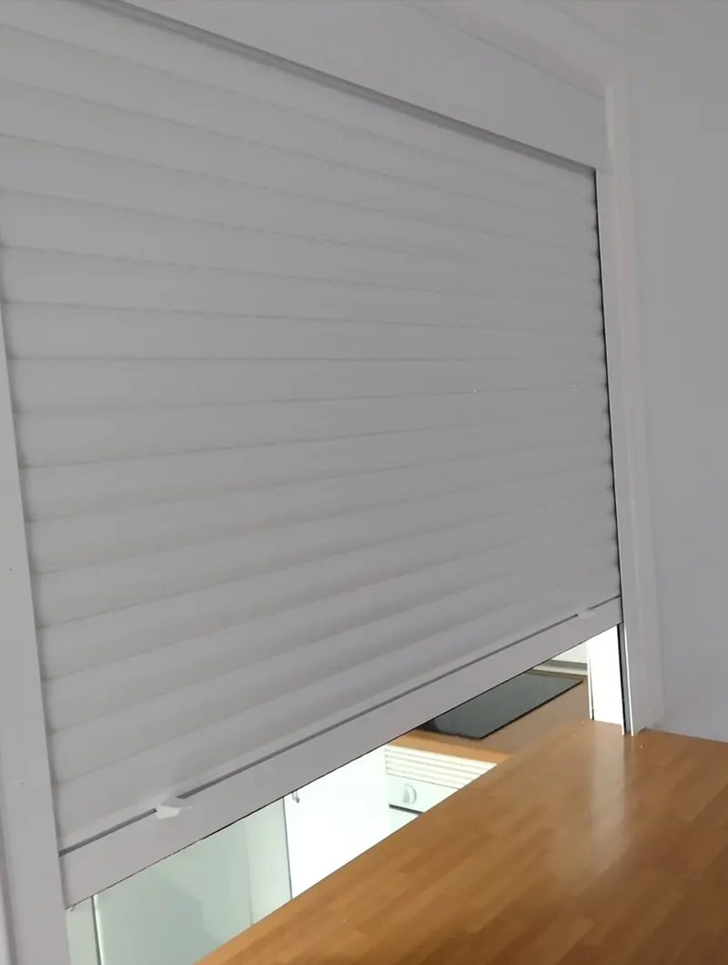 Instalación de persiana de aluminio dentro del salón para separar las áreas de comedor y cocina.